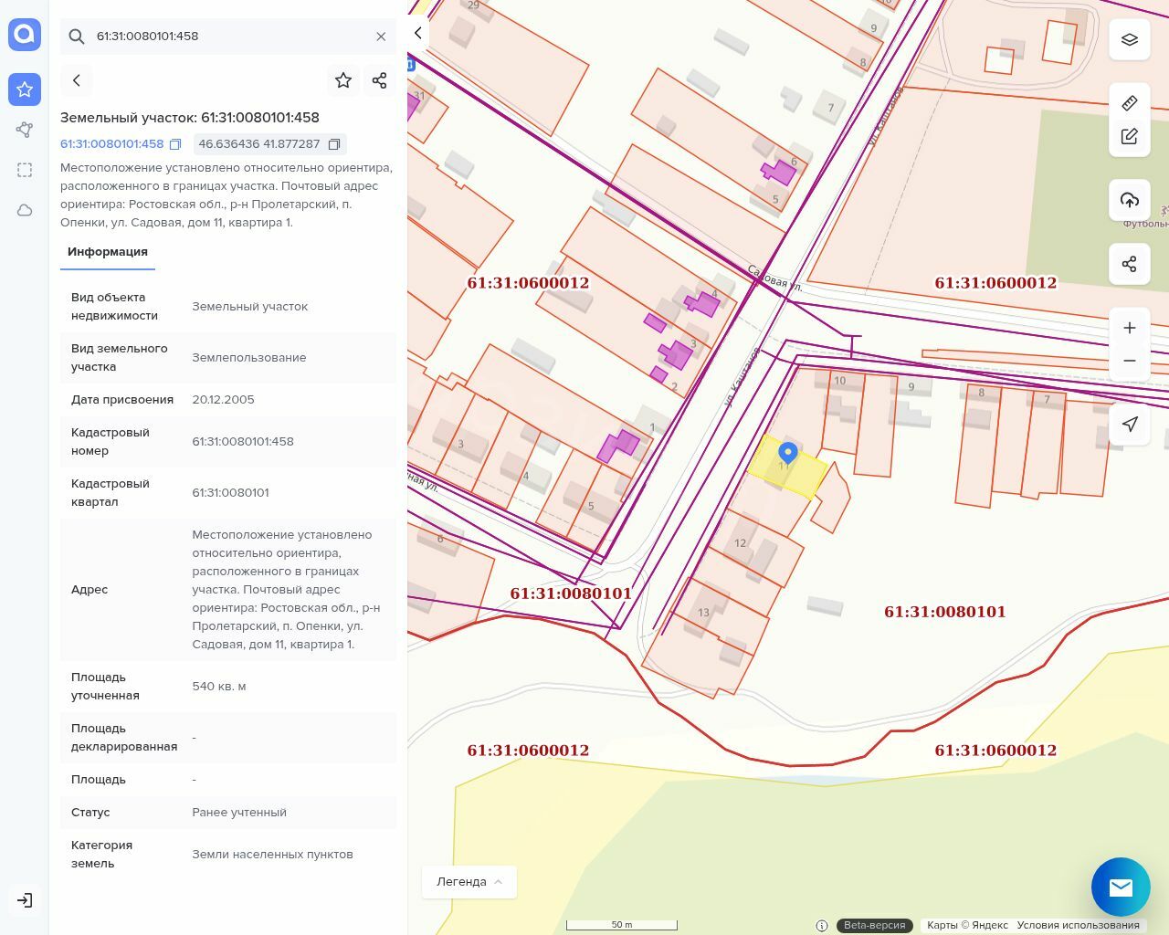 Жилое помещение с кадастровым номером 61:31:0080101:3025, общей площадью 63,7 кв.м. и находящейся под ним земельный участок с кадастровым номером 61:31:0080101:458, общей площадью 540 кв.м.